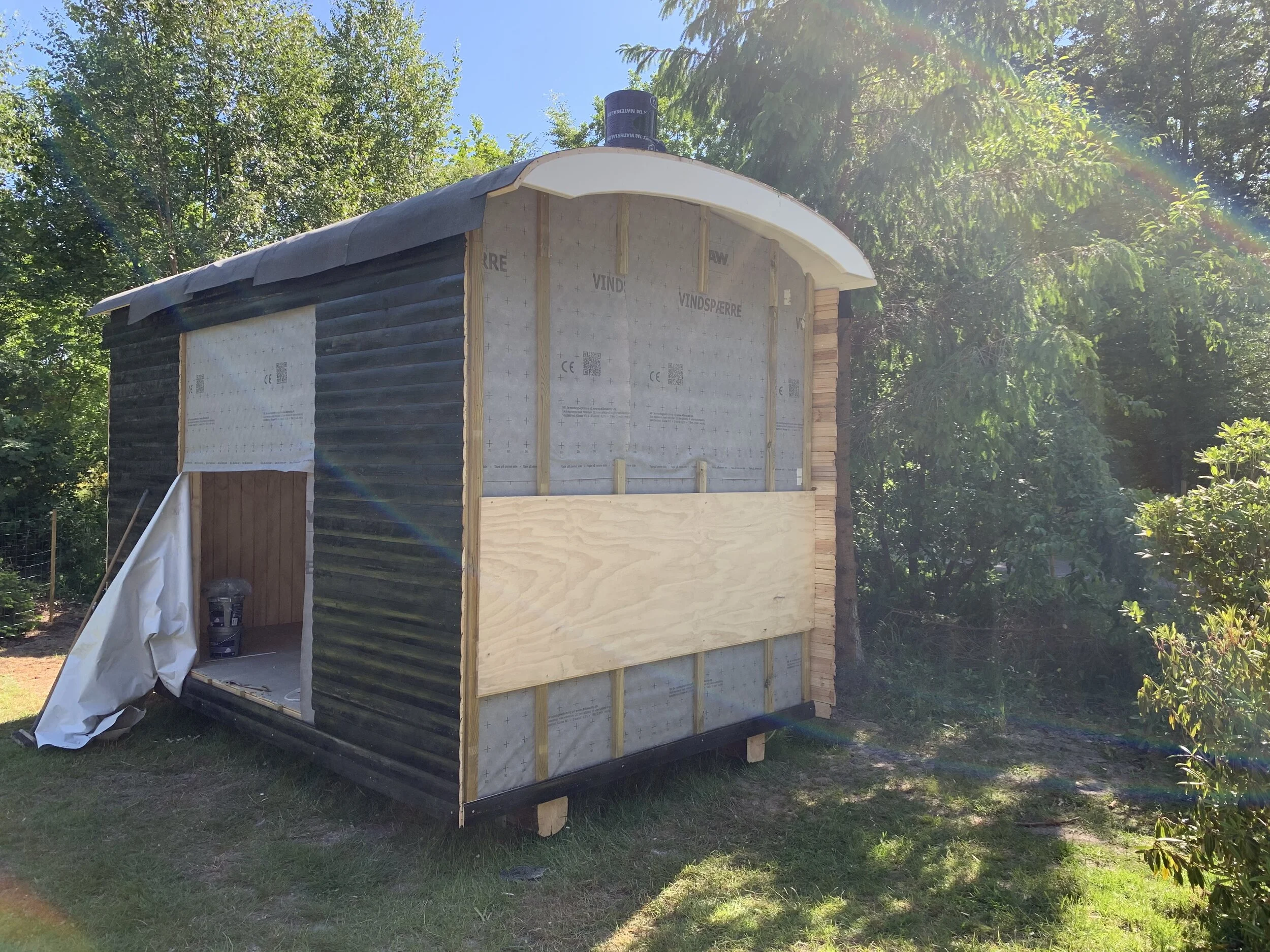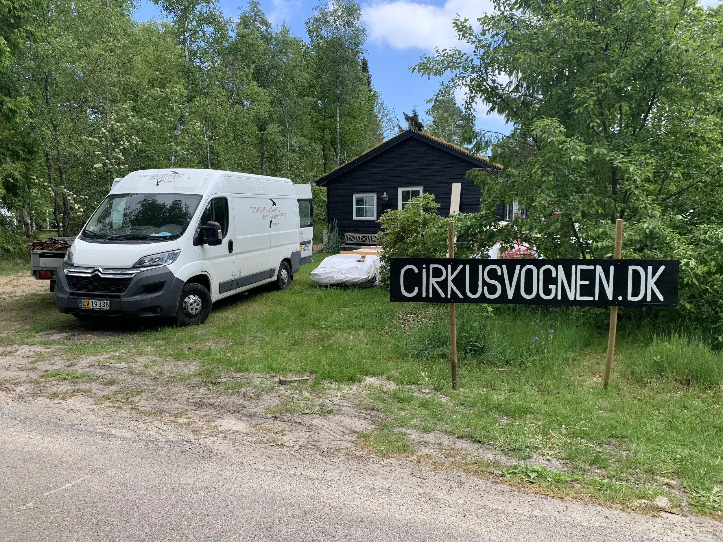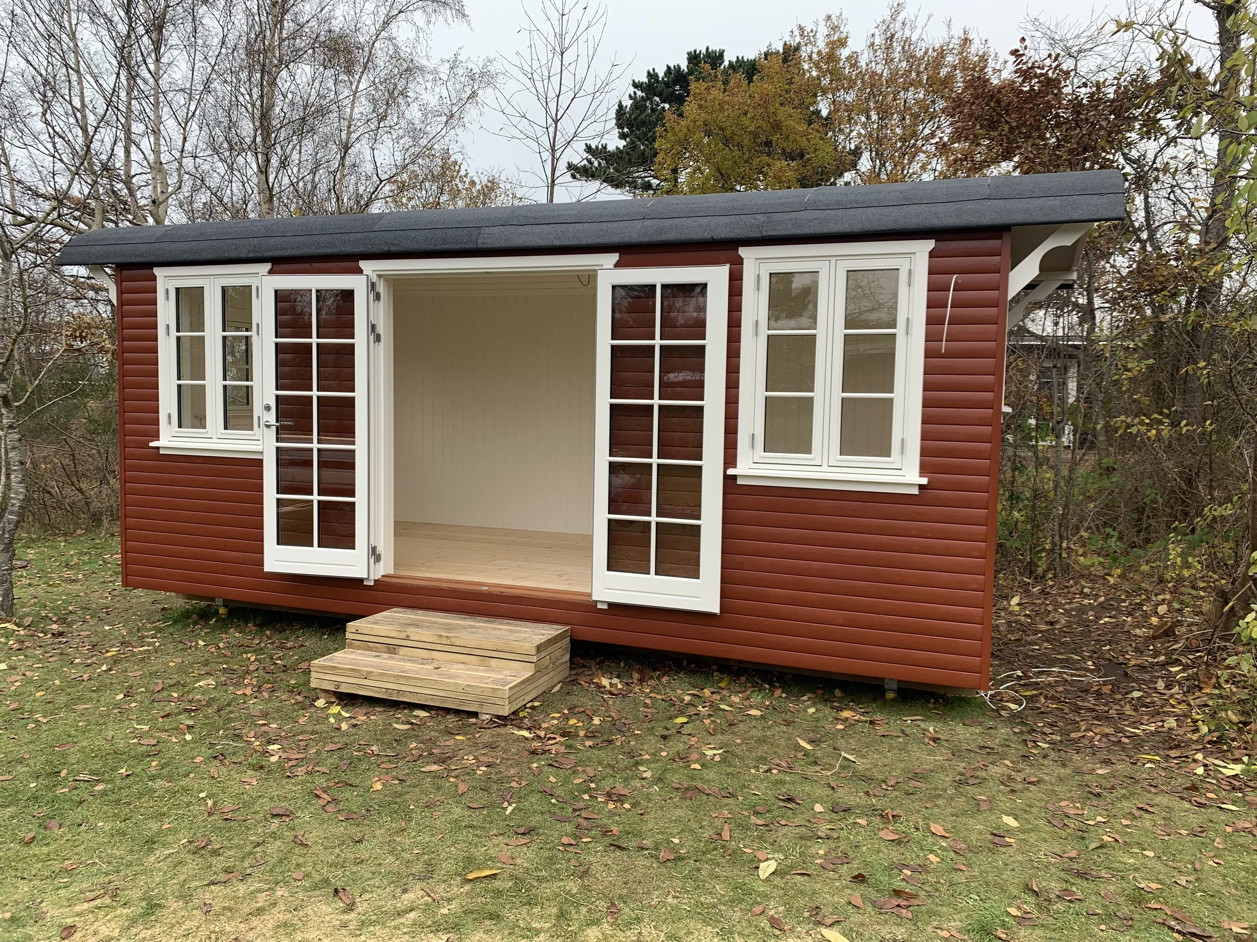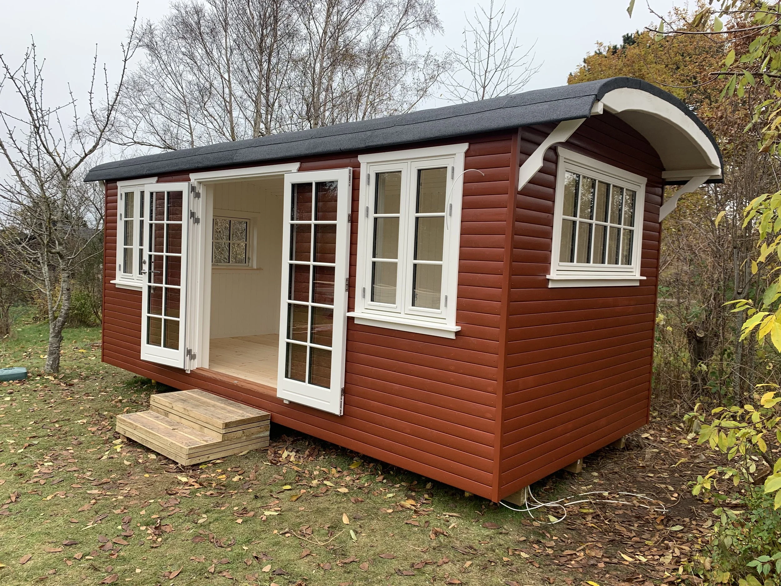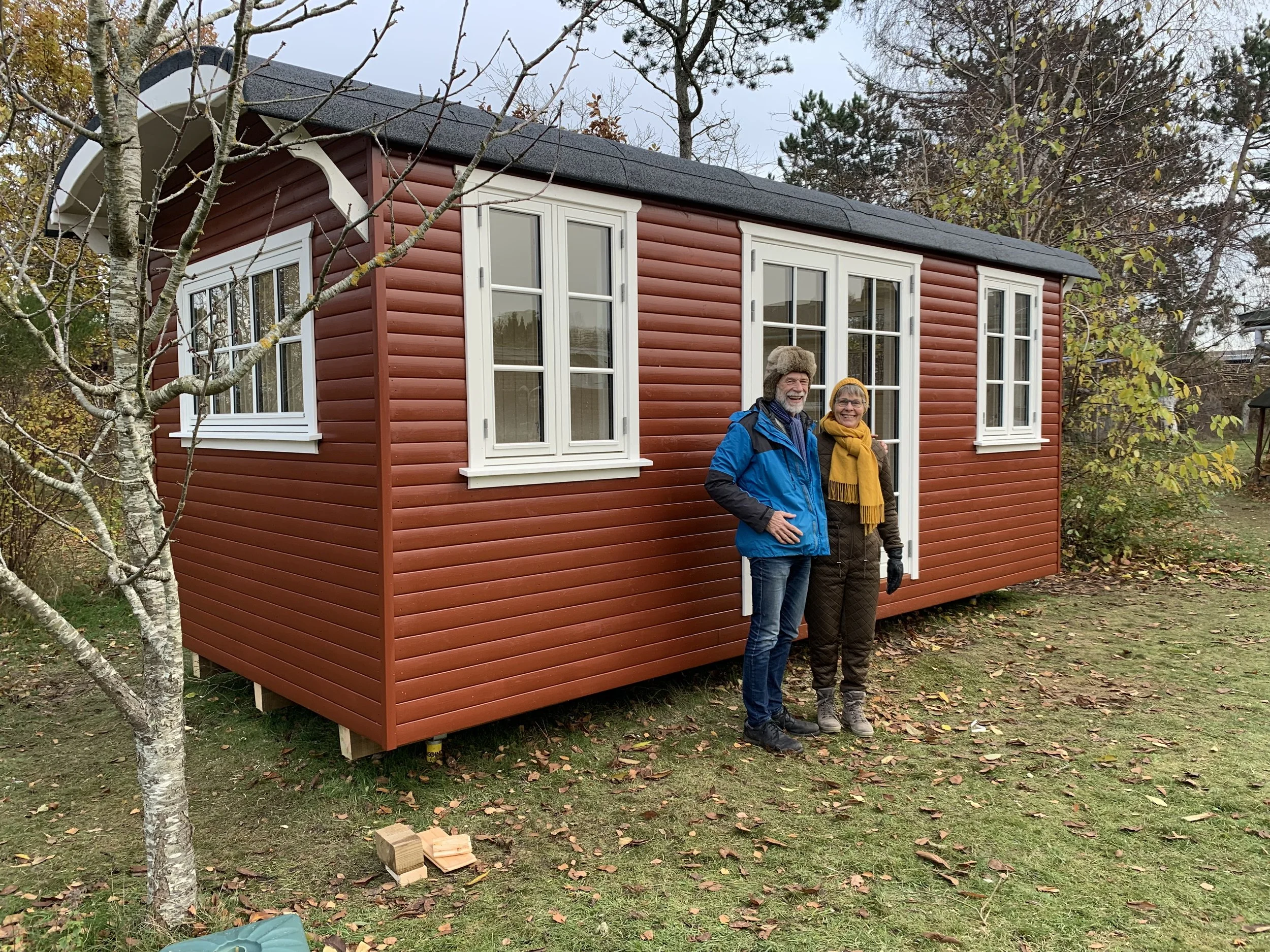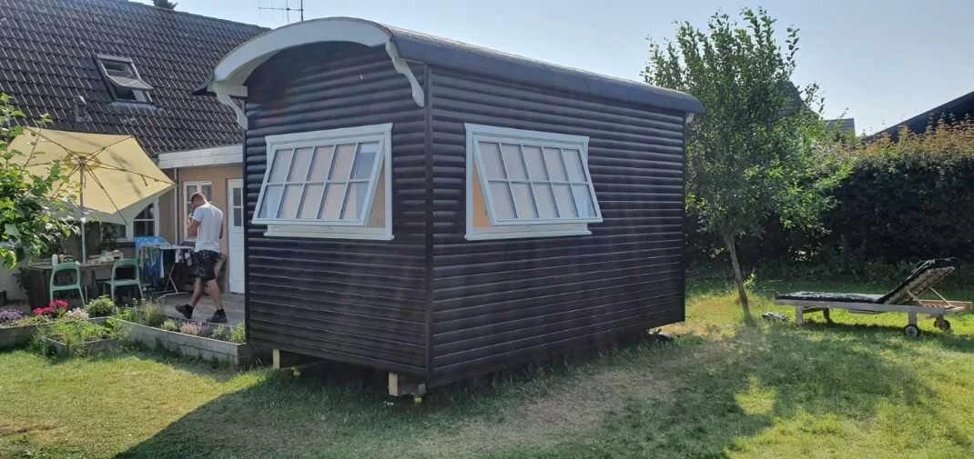 Familie vogn xl i pine med brune vinduer leveret til sommerhus i Asserbo, og monteret på skruefundament.