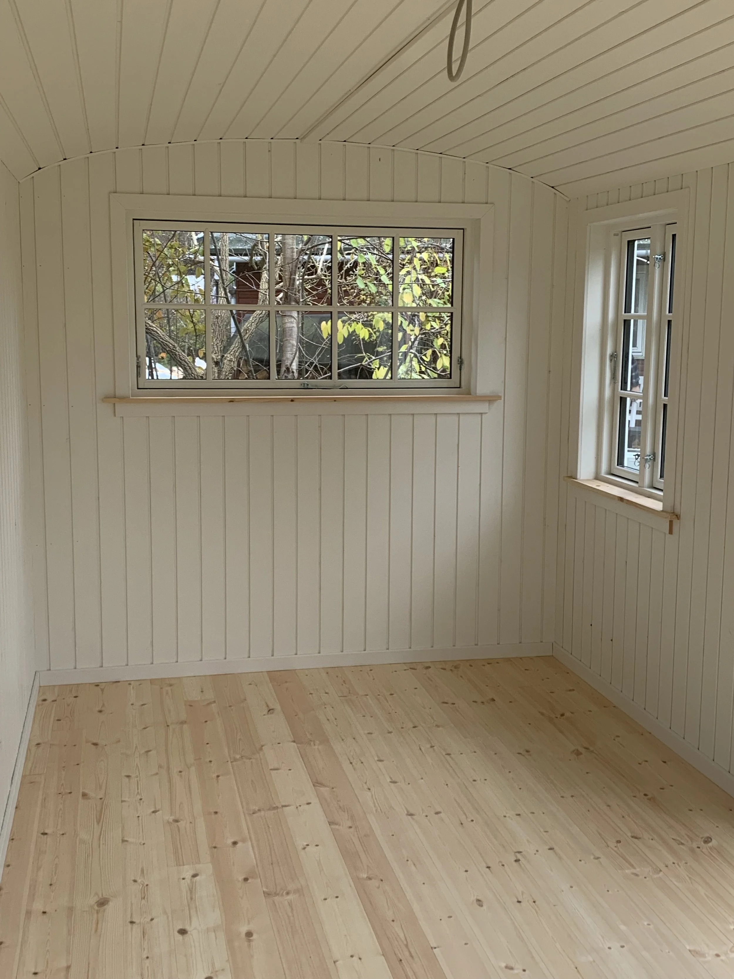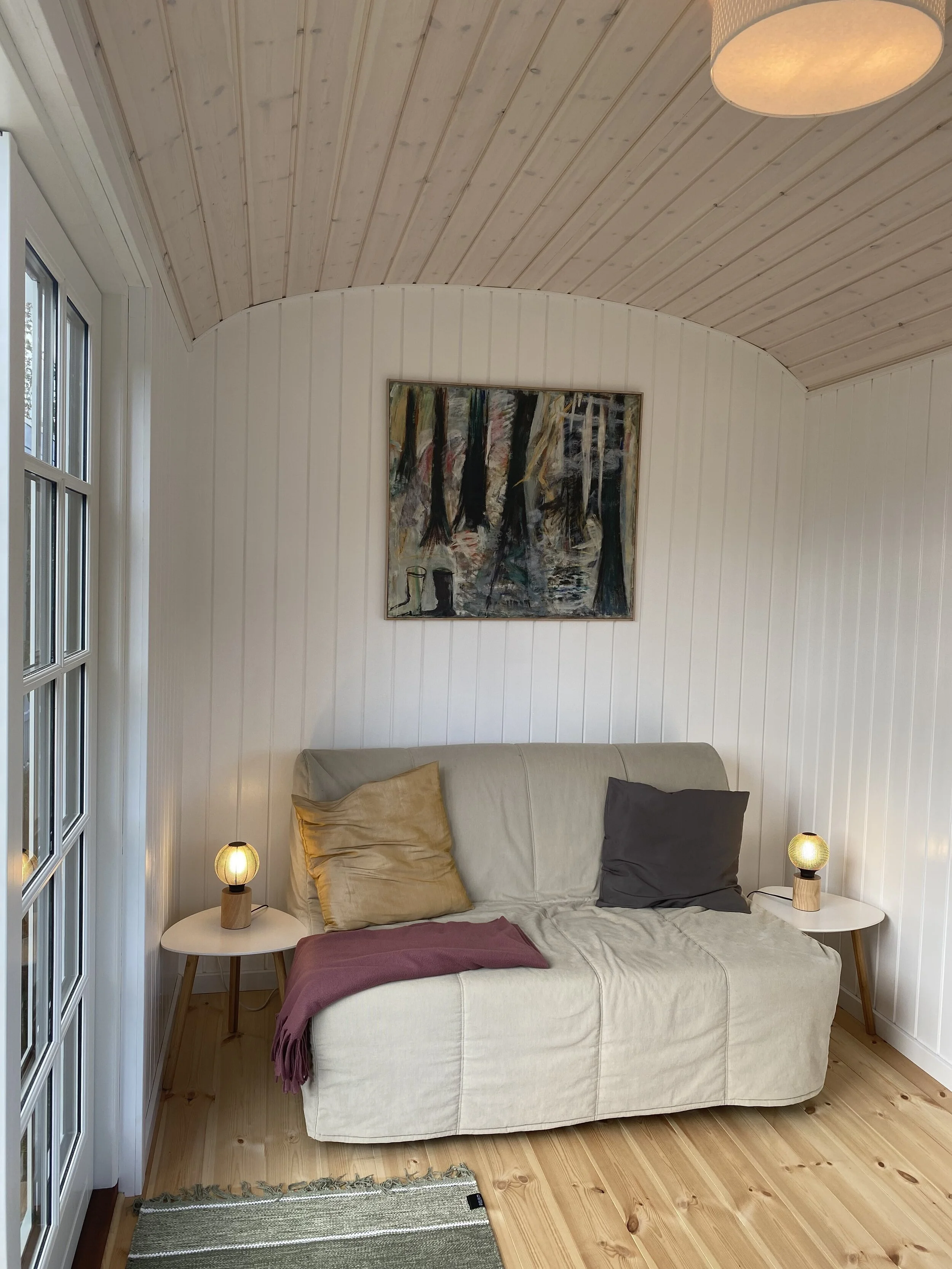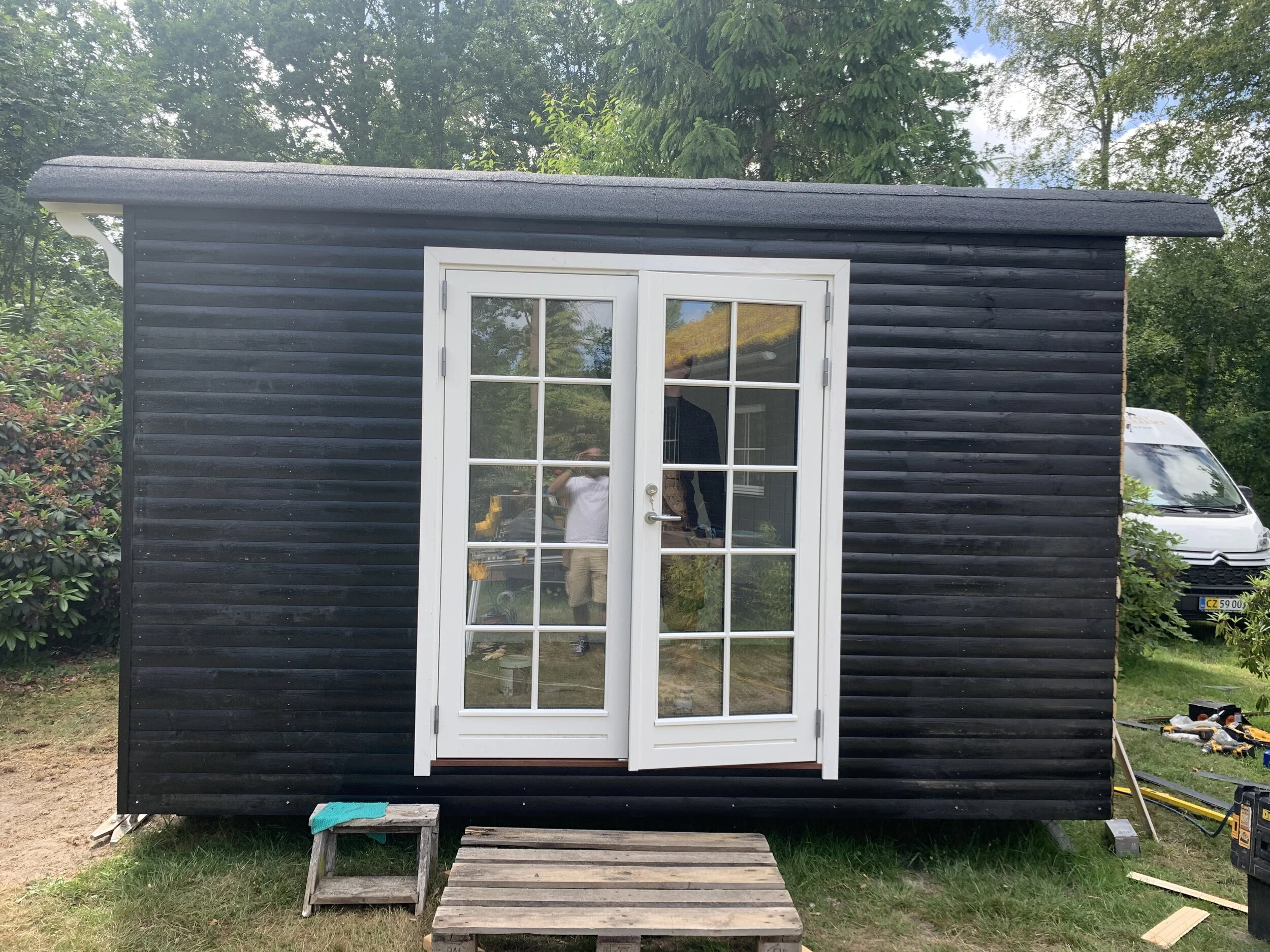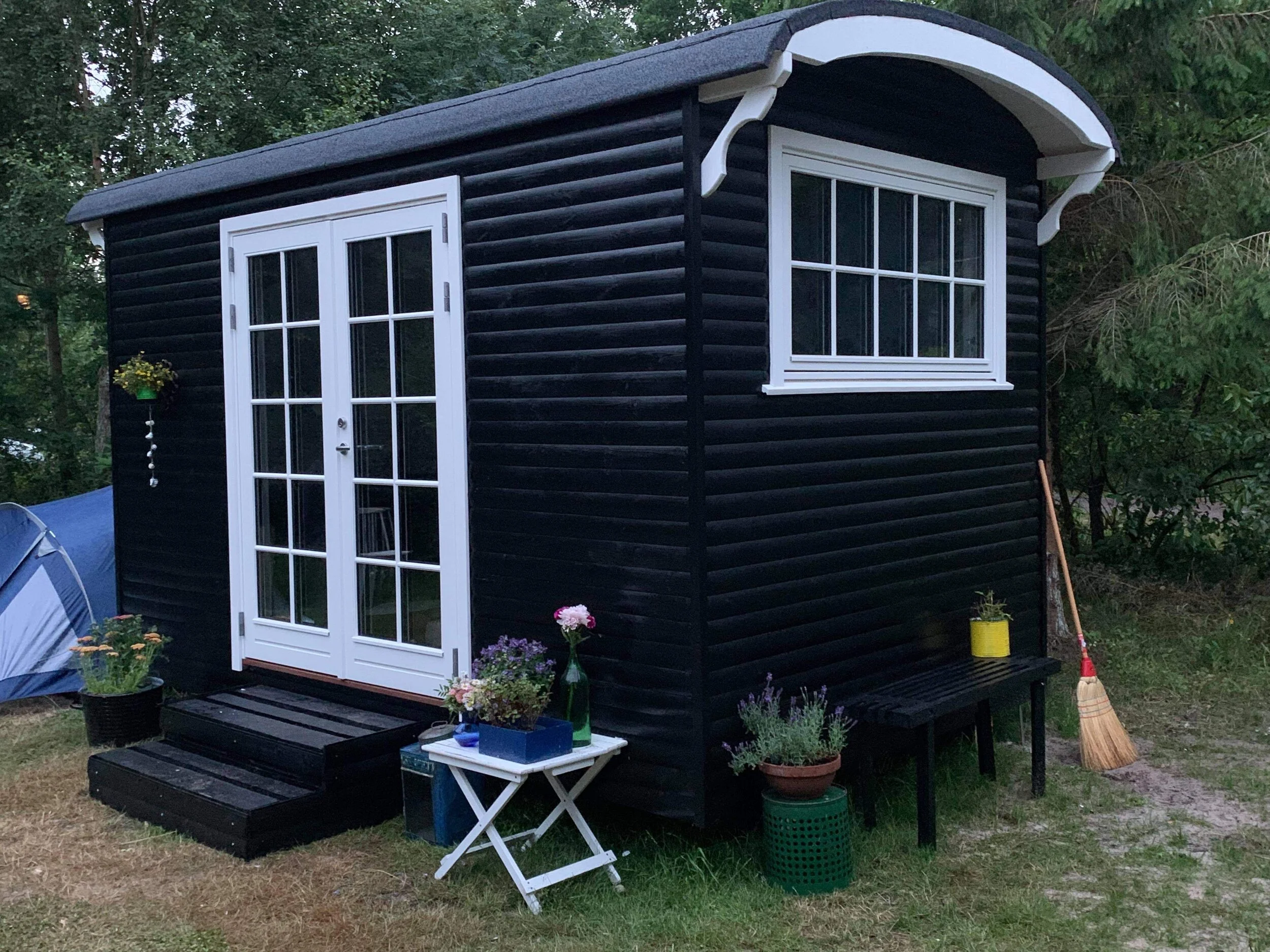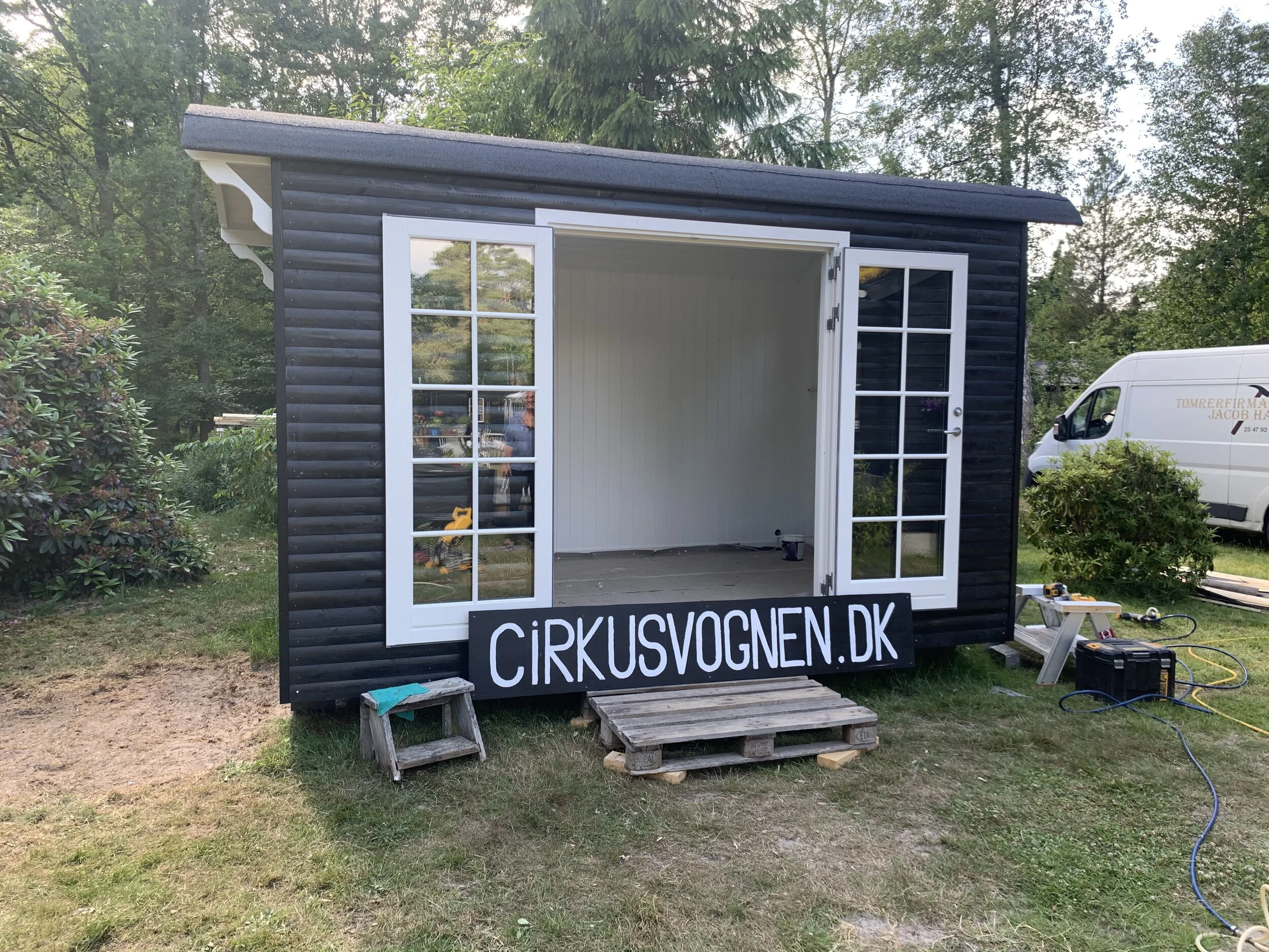 Familie vogn xl i pine med brune vinduer leveret til sommerhus i Asserbo, og monteret på skruefundament.