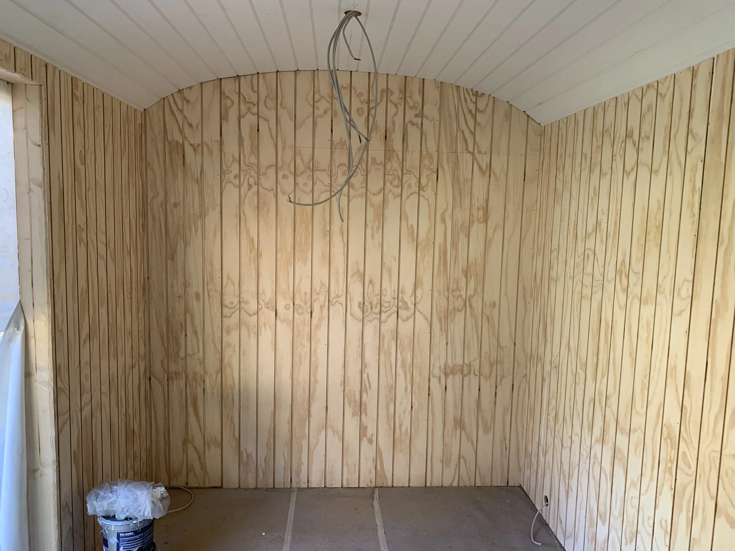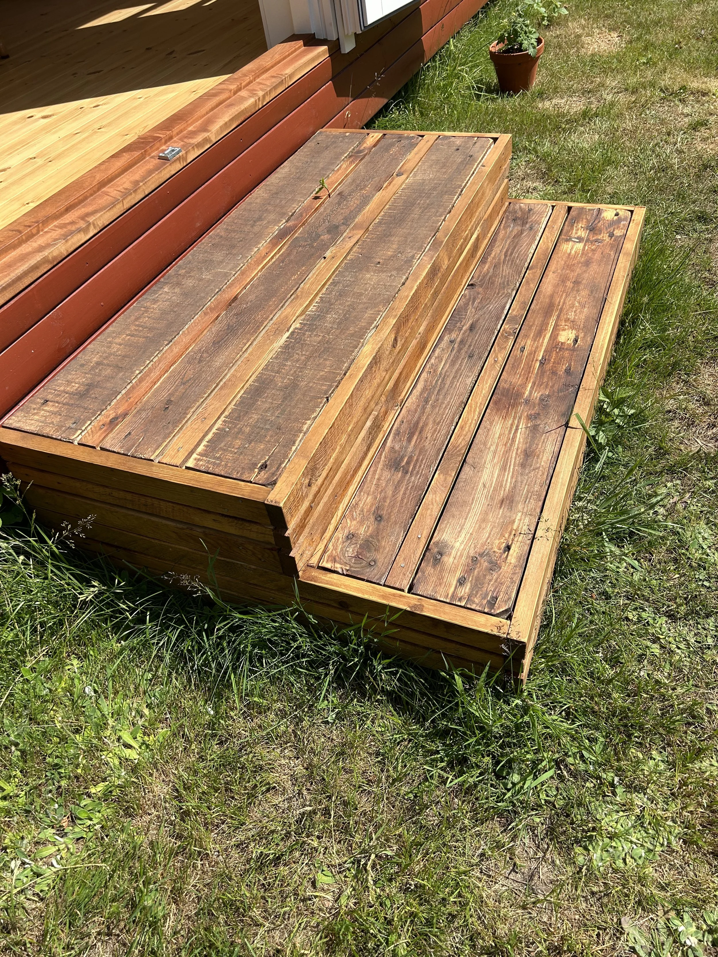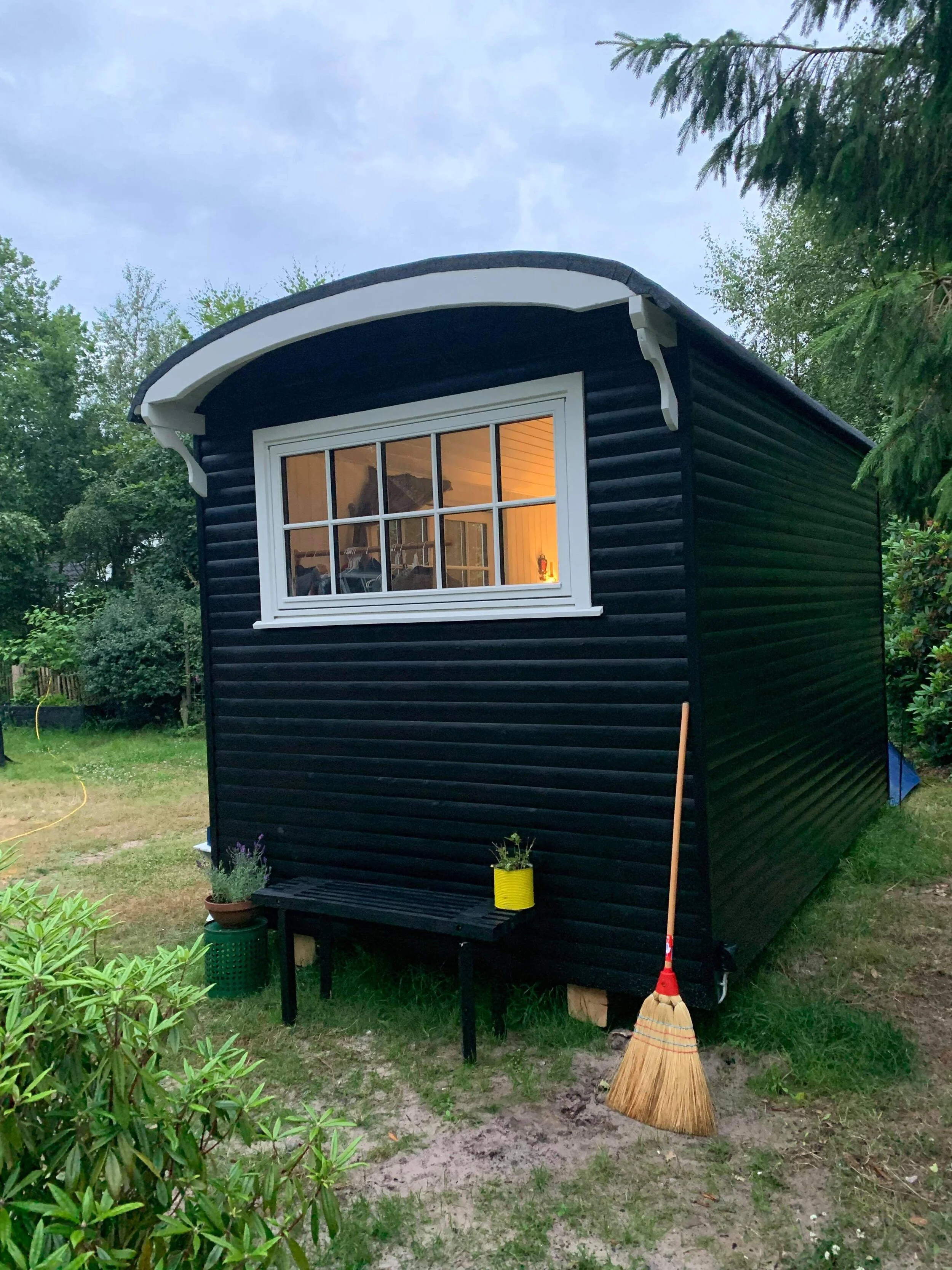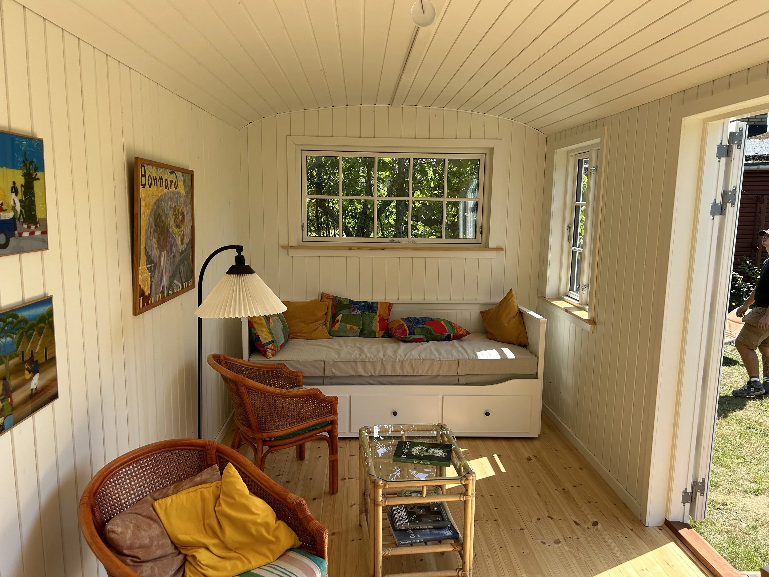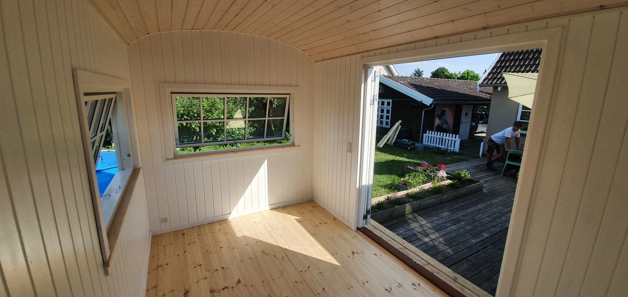 Familie vogn xl i pine med brune vinduer leveret til sommerhus i Asserbo, og monteret på skruefundament.