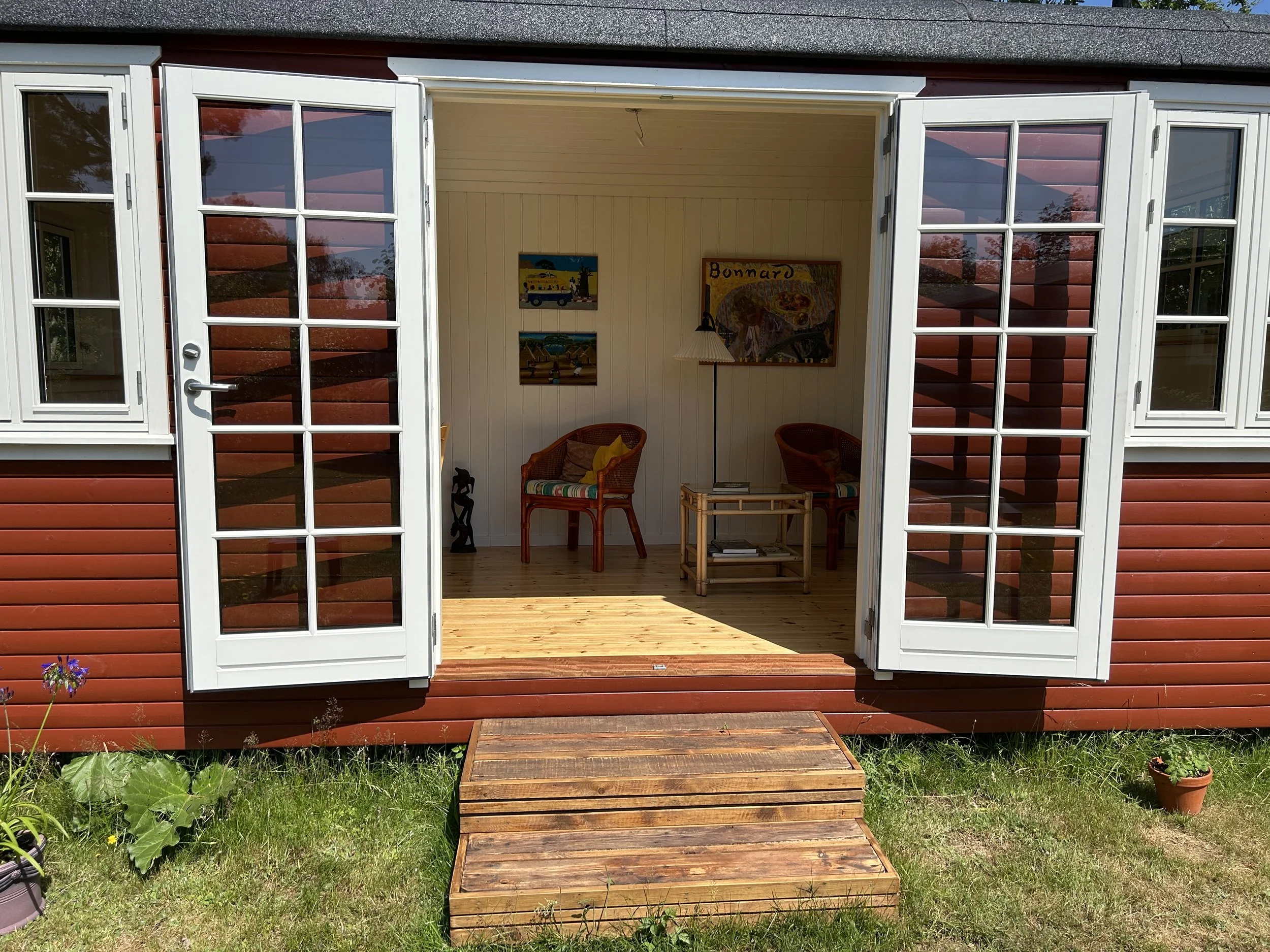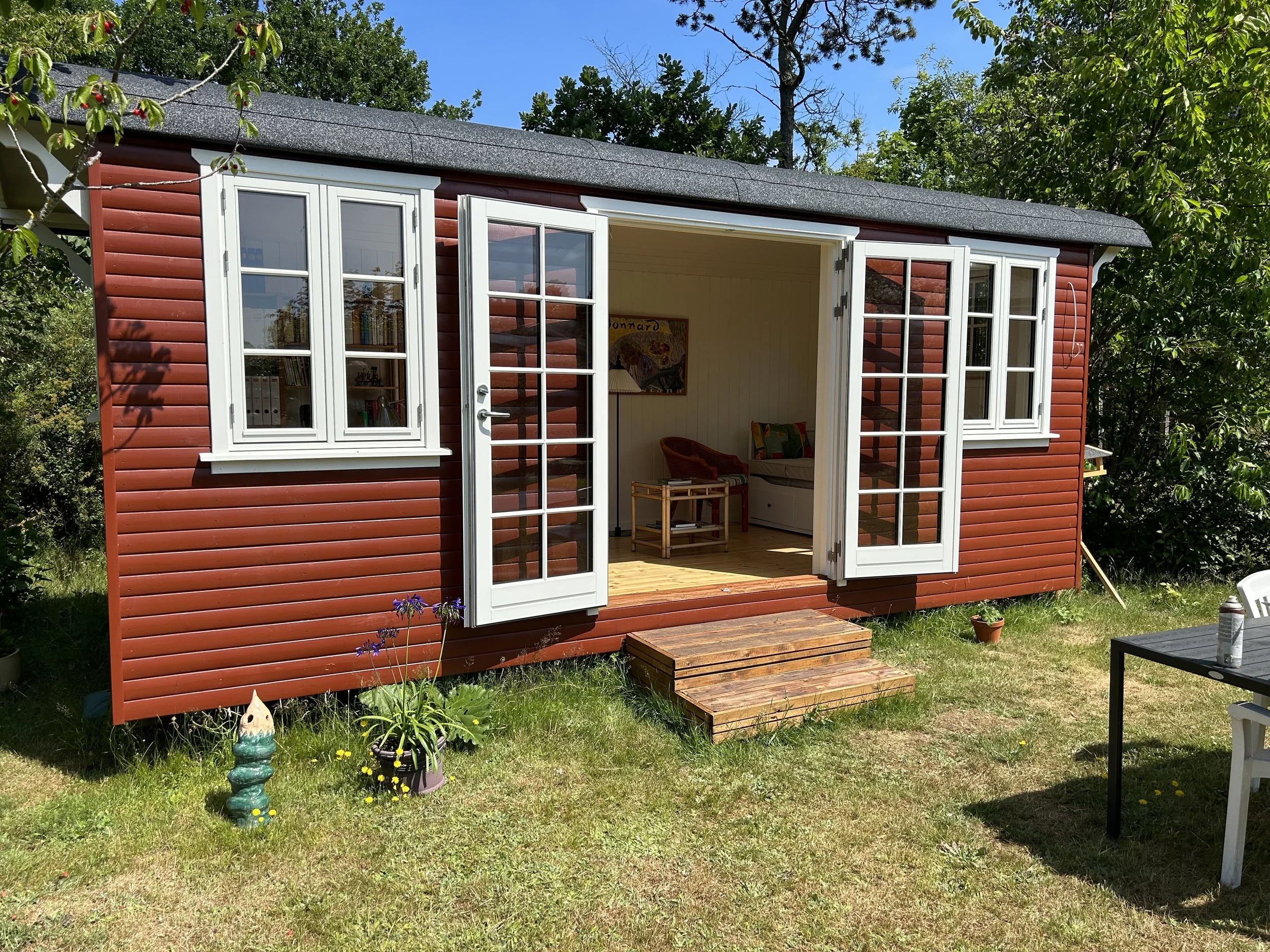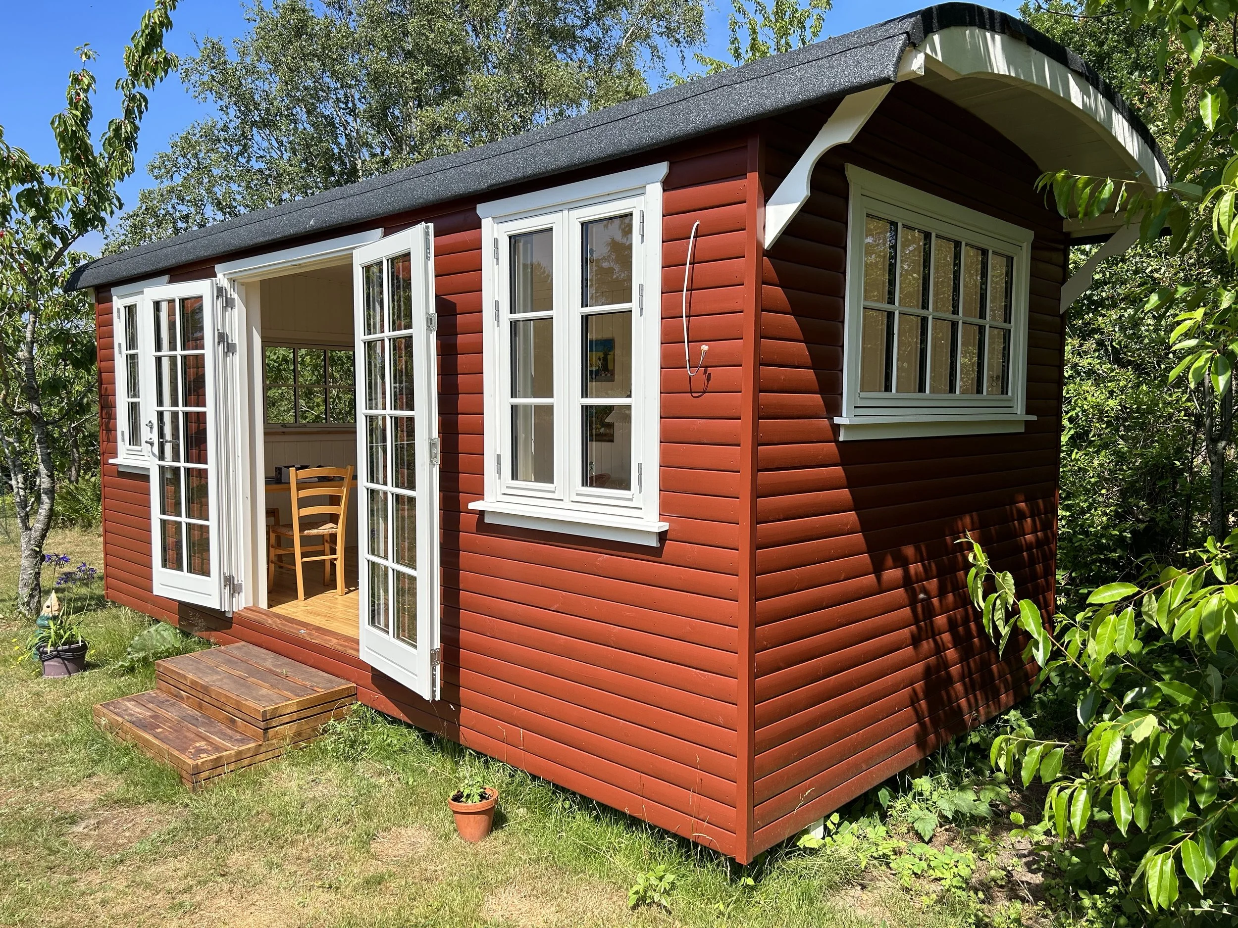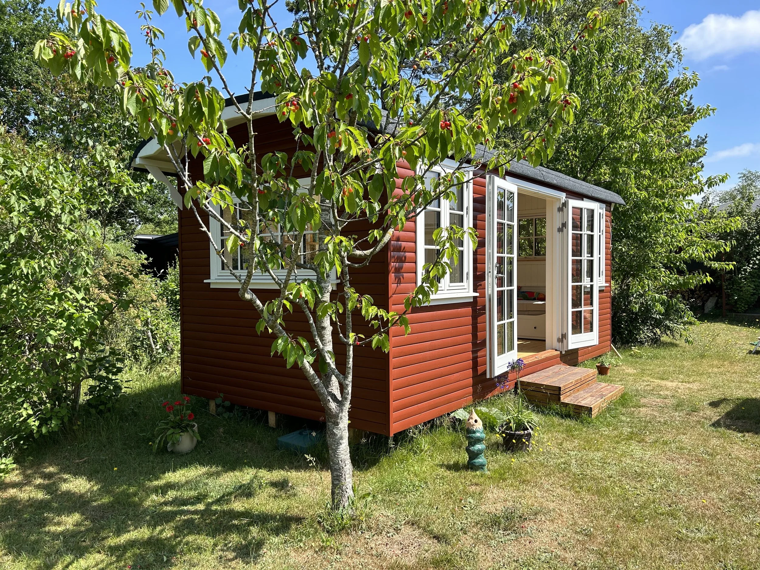 Familievogn i svensk rød monteret på skruefundament i Liseleje